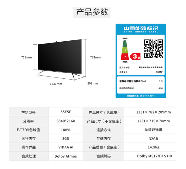 海信(Hisense)55E5F 55英寸 4K超高清 智慧屏 AI声控六路视频通话大屏社交超薄全面屏液晶教育电视机3+32G